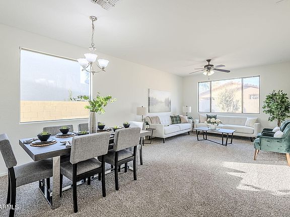 Beautiful 2 story home in highly desirable area in north Goodyear near freeway, shopping, restaurants, and schools. This home has 5 bedrooms, 3 bathrooms, and tons of space. Interior has been freshly painted and recarpeted throughout. Upon entry is a downstairs bedroom and guest bathroom. Continuing into the home opens up to a large formal living and dining room area with natural lighting. On the other side of the home are the family room overlooking the backyard and the recently updated kitchen. Kitchen includes all new appliances, sink, and faucet! Upstairs are 3 secondary bedrooms, guest bathroom, and primary bedroom suite. All bedrooms are well sized. This ideal layout is sure to meet your needs and is move in ready!