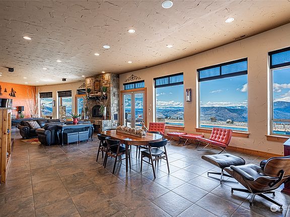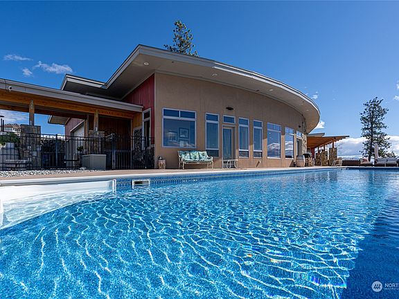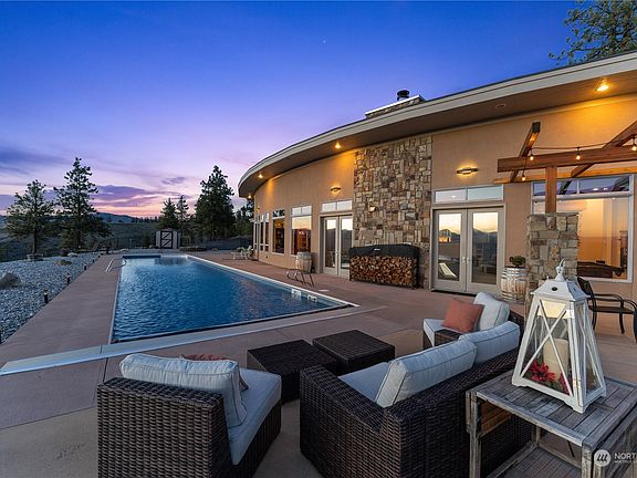 Views from the top of the world! Just five miles from downtown Chelan, this gorgeous custom home on 13.5 acres is an entertainer's dream. Take in 180-degree views, envision pool parties on the patio & enjoy hosting all your friends while overlooking the entire valley & beyond. Featuring a beautiful open-concept main living space with French doors to the pool & patio, stone fireplace & 12' ceilings throughout. 4 bedrooms, 4 bathrooms, huge bonus room plus an office. Primary & two guest bedrooms have French doors onto the patio, all enjoying the same views through massive windows. Radiant floors throughout the home and garage keep you cozy in all seasons. 13+ acres means unobstructed views and privacy. This home is not to be missed!