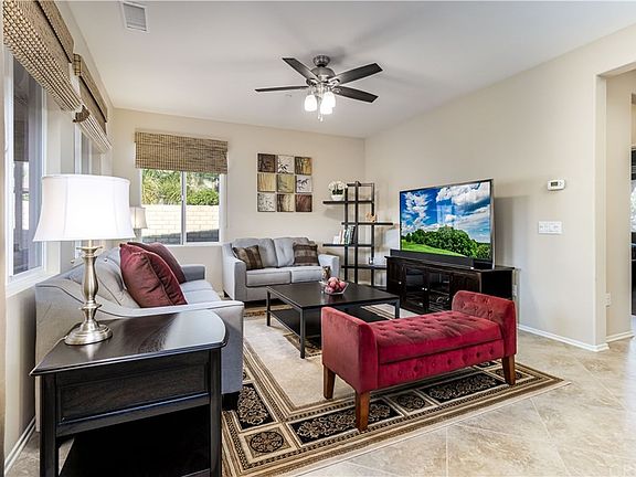 Warm and charming 4 bed, 3 bath, 2547 sq ft home located on a family-friendly cul-de-sac in the highly desirable Plum Canyon development. Entry opens to ground floor living space featuring tile floors, recessed lighting and open archways connecting the spaces. Formal living room leads to spacious great room boasting kitchen, dining, and family room space. Kitchen boasts plenty of storage, in dark wood cabinets and large pantry, and extensive granite countertops including a central island with breakfast bar. Additional dining space can be found in the sunny breakfast nook. Bright and airy family room area opens, through sliding glass door, to covered patio, outdoor fireplace, and manicured back yard for indoor/outdoor living. Ground floor bedroom features carpet, large closet, dedicated ¾ bath, and privacy. Upstairs is a sizable master suite boasting plantation shutters, oversized walk-in closet, and an en-suite featuring dual vanities, large tub, and walk-in shower. 2 further, good-sized bedrooms share a full bath with dual vanities. Additional features include built-in & paid for solar panels, convenient upstairs laundry room, oversized landing at top of stairs which could serve as additional family room or office space, and 3-car garage. Plum Canyon Ranch HOA amenities include community pool and parks. Close to new shopping center going in which will include Starbucks, Nail salon, Italian restaurant and more!