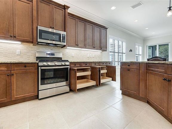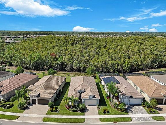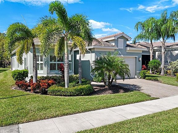 Welcome to an exceptional 4 Bedroom or 3 Bedroom + Den, 3 Bath, 2 car garage open floor plan residence, providing an interior with a soft earth tone color palette perfectly positioned on a private oversized lot. This popular Chandon floor plan offers the additional air-conditioned living space with a builder conversion upgrade incorporating part of the standard cover patio into usable living area. This exquisite property is move-in ready for your immediate enjoyment boasting impressive finishes, including an extended paver patio, pull down shades at great room sliders, laundry room cabinets with sink, plantation shutters, crown molding, 17x 17“ tile throughout the main living area and den, primary bathroom with additional cabinets, upgraded builder tile packages in all bathrooms, tankless hot water heater, upgraded recessed lighting package throughout, 300 amp electrical service, additional lighting and outlets in garage, eight ceiling fans and more. The home site is large enough to add a pool. The kitchen provides GE stainless steel appliances along with a microwave that is vented out, 42” upper wood cabinets, above cabinet and below cabinet lighting, large single bowl undermount sink, base cabinets with pull out drawers, three pineapple shape pendant lights at granite countertop area and impact windows throughout the home. This home has an X flood zone rating. Valencia Bonita is an exceptional 55+ Active Adult community in Bonita Springs, Florida, where you find a lifestyle that provides so much with low monthly fees. Valencia Bonita is a top selling community with a spectacular 45,000 square-foot clubhouse and amenities second to none! The clubhouse is located on a 10-acre complex offering a resort style swimming pool, 60 ft. lap pool, resistance exercise pool, grandchildren wading pool, whirlpool spa, racquet center pro shop, tennis courts, Pickleball courts, bocce courts, dog park, and fire pit. Residence also enjoy performances and parties in the grand ballroom, fully equipped fitness center, spa with treatment rooms, nail salon, restaurant with indoor and outdoor bars, card rooms, sports lounge, arts and crafts room, yoga/exercise, studio, ping-pong, massage rooms, and so much more!
