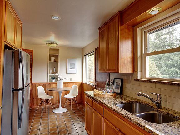 Welcome to this solid and well designed mid-century home in Magnolia. Located on a quiet street, this home has views of Mt Rainier, downtown and Queen Anne's west slope. A green belt behind and to the north provides privacy. SE exposure provides sun and warmth. Oak floors, newer wood-framed picture windows, copper plumbing, new kitchen with slab counters and stainless appliances and updated baths. Large master on main floor. Big lower level with family room and two bedrooms. Real 2 car garage.