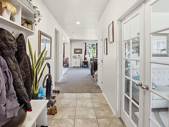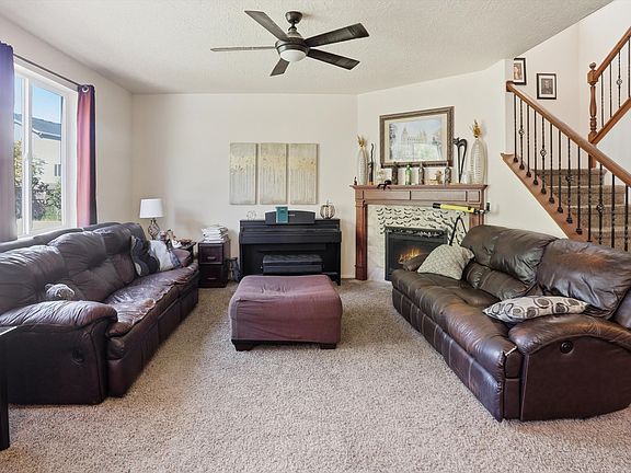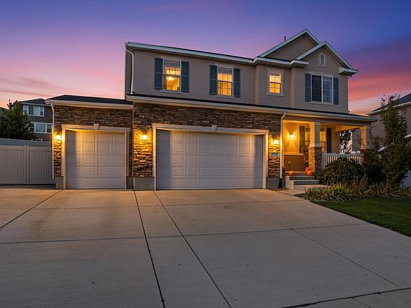 This stunning 6-bedroom, 3.5-bath home offers a perfect blend of comfort and functionality. Features include a water softener, in-ground trampoline, and a fully finished 3-car garage with built-in shelving. The gourmet kitchen boasts granite countertops, stainless appliances, and optional double ovens, perfect for entertaining. The spacious master bath has a jetted tub and double sinks, complemented by a guest bath with double sinks. Upstairs, enjoy a loft, laundry room, and front den with French doors. The fully landscaped front and back yards feature mature trees, including fruit and evergreens, garden boxes, retaining wall, and excellent views of lake and mountains. The fireplace adds cozy charm. The basement is fully finished with cold storage. High 9-foot ceilings, fiber internet, and an ideal layout make this home perfect for large families. Schools and friendly neighbors complete this exceptional package.