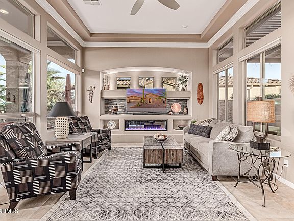 Beautifully updated Aurora floorplan on the golf course with stunning mountain views, an east-facing backyard for incredible sunrises, and over $140K in recent improvements & upgrades! This spacious home features soaring 12' ceilings, crown molding in all major rooms, and an open, versatile layout with a front den, formal dining/flex space, and a light-filled family room with gas fireplace & option to change flame colors, stacked stone entertainment wall, and expansive windows framing the views. The chef's kitchen showcases quartzite counters and backsplash, dual islands, pendant lighting, and access to a private courtyard just steps away. The primary suite offers a remodeled bath with quartzite counters, soaking tub, and two generous walk-in closets, while the guest bath and laundry room also feature quartzite countertops. Both bedrooms have new carpet (2024). Custom sliding glass doors provide privacy to the den/office, creating an ideal workspace. Extensive upgrades include two new A/C units (2021 & 2025), new roof with transferrable warranty (2025), Rainsoft water treatment system, fresh exterior paint (2024), and countless designer touches throughout. Step outside to a fully redesigned courtyard and backyard oasis featuring travertine hardscape, a soothing water wall with fireplace, outdoor seating area with custom built-in BBQ grill, stand-alone firepit, additional water feature, and misting system all perfect for entertaining or relaxing with friends. Welcome to the active adult community of Trilogy at Vistancia where you will find outstanding amenities, including 2 clubhouses, pickleball, tennis, bocce ball, fitness centers, swimming & golf, just to name a few!