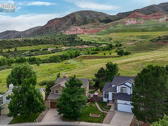 Nestled in the scenic foothills on the highly sought-after west side of Colorado Springs, this stunning single-family home is a true mountain retreat that effortlessly combines modern comfort with breathtaking natural beauty. Backing directly to open space, you’ll enjoy endless hiking adventures right from your backyard—just walk out the back gate to the trailhead and immerse yourself in nature while soaking up incredible views of Blodgett’s Peak and the Rampart Range. This spacious 5-bedroom, 4-bath gem welcomes you with vaulted ceilings, an inviting gas fireplace with under-mantel lighting, elegant hardwood and LVP flooring, and fresh interior paint throughout. The bright, open kitchen features granite countertops, composite sinks, Bosch dishwasher, touch faucet, convection oven, pantry with roll-out drawers/shelves, and a charming shiplap plank ceiling. Arched doorways and recessed can lighting add a touch of sophistication, while ceiling fans, central AC, and humidifier keep you comfortable year-round. Upstairs, the master suite is your private sanctuary boasting a luxurious 5-piece bath with a jetted tub, walk-in closet, and Juliet balcony. Bedrooms features plant shelves, and the home has several automatic shades for added style and convenience. Step outside to your large composite back deck complete with an impressive 18-foot retractable awning—ideal for outdoor dining or simply watching the abundant wildlife wander just beyond your fence. Relax on the flagstone patio area or entertain with ease thanks to the built-in Bluetooth speaker system. Practical upgrades include a 50-gallon water heater, electrostatic air filter, epoxy-finished garage floor, durable stucco exterior, and CAT 6 wiring throughout for modern connectivity. Only 1.5 miles to Ute Valley Park too - great location! With stunning mountain views, this is Colorado living at its finest. Don’t miss your chance to own a piece of paradise in the heart of the foothills!