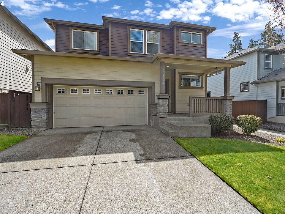 Outstanding Craftsman Style Traditional home nestled in the heart of Wilsonville. Welcoming covered front porch with wonderful curb appeal. The covered back patio provides an ideal setting for outdoor entertaining overlooking the easy-maintenance turf grass yard. Elegant finishes with engineered wood floors on the main and carpets throughout the bedrooms. The main level welcomes you with an open floor plan w/lots of natural light and a cozy gas fireplace. The kitchen is a chef's delight, boasting granite countertops, stainless steel appliances, and ample cabinet space for storage. Primary suite with 2 closets. Primary bath, double sinks, soaking tub, tile floors and tile counters. Work from home in your private upstairs loft. Two additional bedrooms and a full bath provide plenty of space for family or guests. Laundry room upstairs for your convenience. Washer, dryer, and newer refrigerator included. Attached two-car garage w/custom built-in storage shelf for all your belongings. Situated in a desirable neighborhood with easy access to freeways, shops, restaurants, and schools. Don't miss your chance to make this stunning property your own!