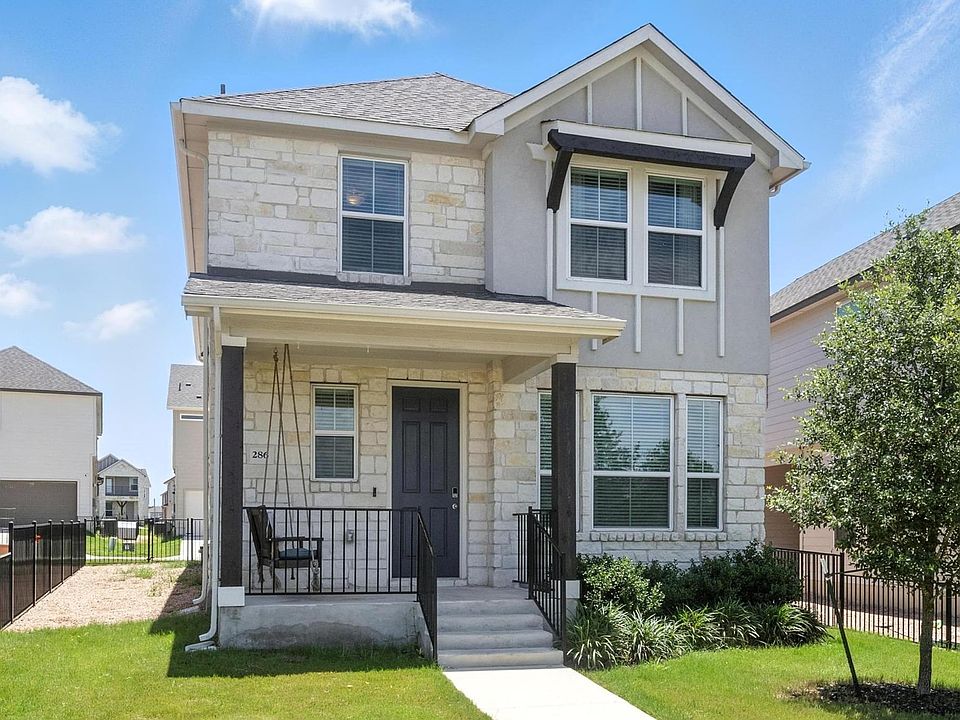 Schedule appointment through Showing Time. Great home with access green space, playground and cluster mail boxes directly across the road. The yard is fenced. Comes with a water softener, refrigerator, washer/dryer. Custom blinds throughout. The upstairs game room/second living room is a more important space than you may realize. The home has been well taken care of, and minimally lived in (built in 2022). Schools are exemplary, the town is picturesque, and HEB and Home Depot are very close by. The neighborhood has a pool and there are great walking trails next door at Founders Park.