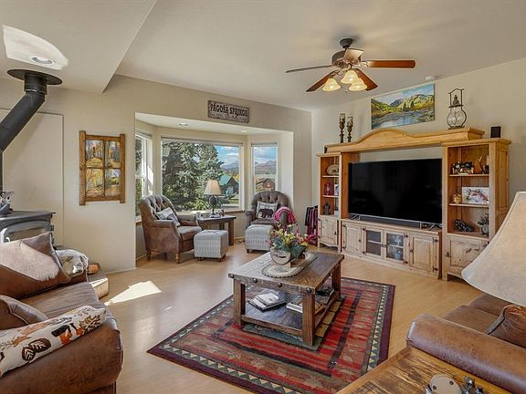 Big mountain viewsGranite countertopsWood burning stoveForced air heating systemOpen floor planNatural lightingHome office