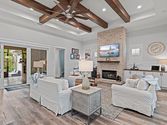 Immaculate, one-story custom fully furnished home in the desirable neighborhood of rental restricted Sea Dunes off of 30A. Perfect as a primary residence or second home with an excellent location nestled among the trees on a cul de sac and close to the beach. Inviting open concept floor plan, perfect for family and entertaining with cook's kitchen, living and dining areas as well as an adjoining screened lanai and patio. Tastefully appointed with magnificently12 ft. raised ceiling and beams, recessed lighting, 2 x 6 framing, large impact windows, open cell spray foam under the roof and on all exterior walls, screened patio, hot tub and glass sliders offering abundant natural light, LVP floors, plantation shutters, gleaming quartz counters in kitchen and baths, oversized kitchen island and pantry, upgraded lighting and ceiling fans.