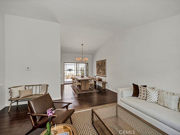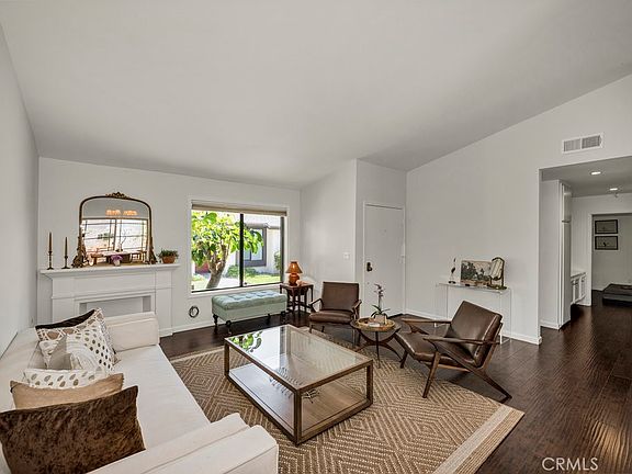 This beautifully reimagined single-level townhouse showcases high-end finishes and a true sense of pride of ownership. Offering 3 bedrooms, 2 bathrooms, and approximately 1,403 square feet of living space, this residence is located in one of Sierra Madre’s most desirable single-story complexes. The living and dining areas feature soaring ceilings, abundant natural light, warm engineered wood flooring, and a welcoming fireplace, making this the true heart of the home. The chef’s kitchen is a standout, with ample counter space, abundant cabinetry, Caesarstone countertops, a custom tile backsplash, and high-end stainless-steel appliances. A well-placed sink window overlooks the private yard, filling the space with light, while the inviting breakfast area is enhanced by a custom-built walnut hutch that adds both warmth and functional storage.