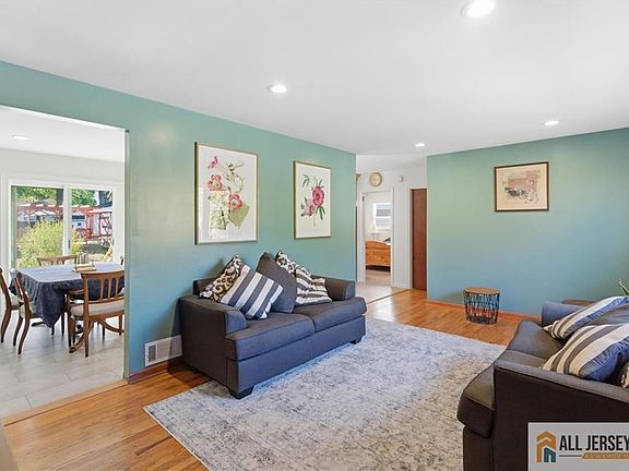 Beautifully Renovated 4-Bedroom Ranch with Full Basement and Spacious Backyard Thoughtfully updated in 2023, this inviting ranch offers a seamless blend of comfort and modern style. The sleek new kitchen features honey-brown maple cabinetry, marble-style countertops, and stainless-steel appliances including a professional-grade six-burner gas range and a refrigerator with smart-screen display. A matte black faucet, coordinating hardware, and recessed lighting add a sophisticated finishing touch. Hardwood floors flow throughout the main level, complemented by numerous replaced windows including a distinctive four-lite bow casement window that fills the home with natural light. The layout includes four bedrooms, a first-floor laundry room, and an attached garage for convenience. Downstairs, a full basement offers abundant storage or future living space possibilities. Outside, a large backyard features beautiful new paver patios (2023), perfect for entertaining, play, or relaxation. With its vinyl siding exterior, updated finishes, and thoughtful renovation, this home is move-in ready and located near schools, shopping, parks, bus, train and commuter routes.