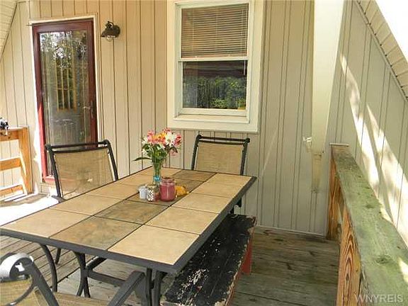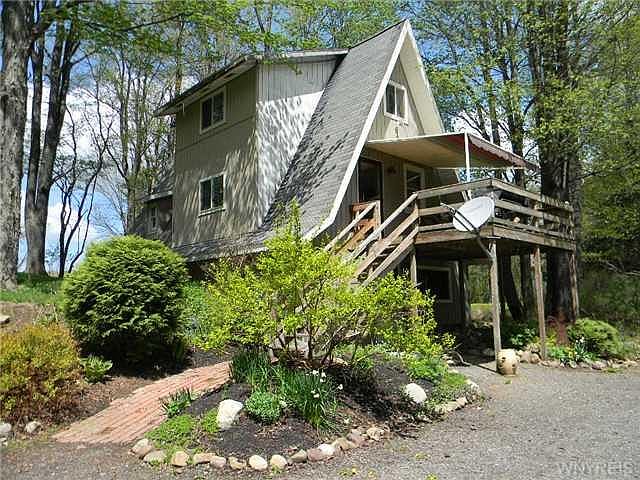 This cozy A-Frame sits on a private 1+ acre lot with newer garage and shared use of 2 ponds for fishing or enjoying a paddle boat ride. A deck with awning provides a great spot to enjoy the view while dining outside or just enjoying your morning coffee. Home offers a spacious loft bedroom, full bath on the main floor, 2nd bedroom and eat in kitchen. The walk out basement could be additional living space and currently has laundry room area and half bath.