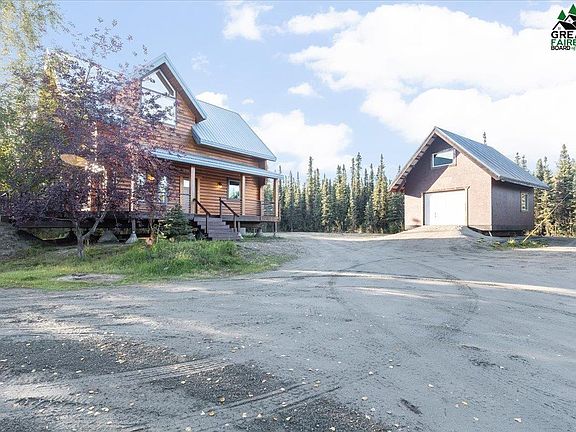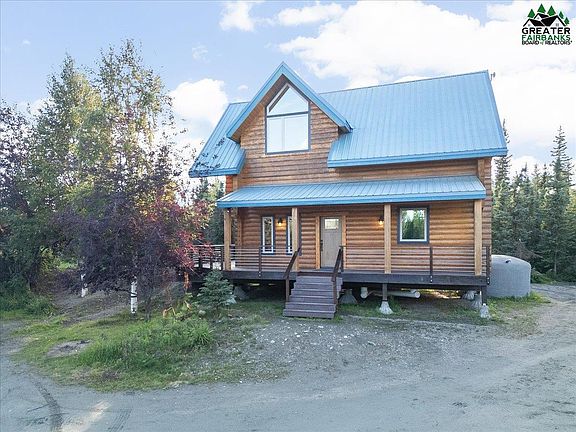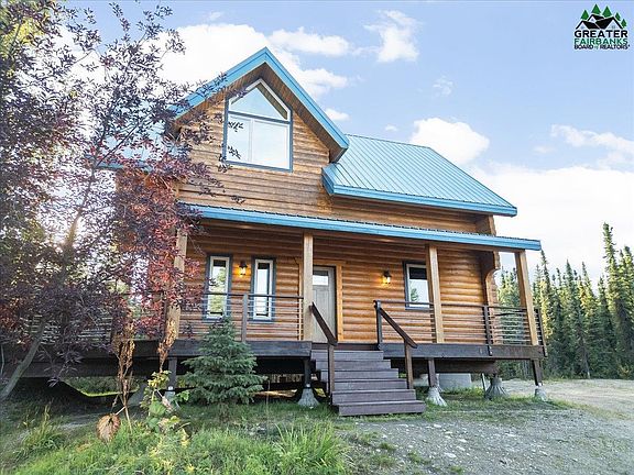 Discover privacy and quality in this beautifully crafted 2-story log home located in the desirable Goldstream Valley. Sitting on over 2 acres, this property offers a perfect blend of Alaskan character and modern comfort. Inside, the home features a spacious kitchen with solid surface countertops, stainless steel appliances, and plenty of room for gathering with family and friends. Tall ceilings and an abundance of large windows bring in natural light, brightening the long winter months. Upstairs, you’ll find sizable bedrooms and a stunning bathroom highlighted by a walk-in shower. The property also includes a detached heated garage with additional space above—ideal for storage or the potential to be finished into a studio or efficiency unit. Homes of this caliber, in such a fantastic location, are rare to find.