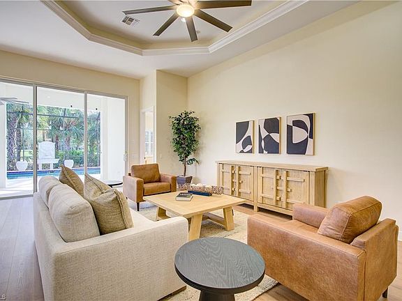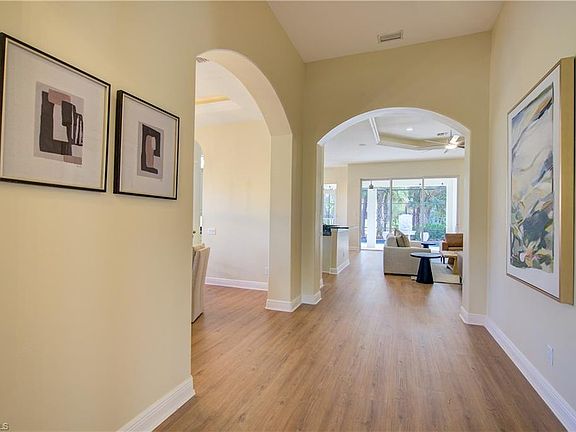 Freshly Renovated Gem on Pienza Court! Nestled at the end of a peaceful cul-de-sac, this beautifully updated single-family home offers modern elegance and comfort. With Golf Membership Included and no waitlist, this property provides a rare opportunity to enjoy the coveted Vasari lifestyle. TURNKEY with new furnishings included, this 3-bedroom, 2-bath home features an office/den and a formal dining room, creating a versatile layout for living, working, and entertaining. Recent renovations include waterproof luxury vinyl wood flooring, fresh interior paint on walls, ceilings, trim, cabinets, and doorsincluding the front door. New roof, exterior painting, and landscaping were completed in 2022, ensuring long-term value and curb appeal. Plantation shutters have been installed on all windows, complementing the homes crisp and contemporary feel. Updated light fixtures and fans enhance every room, while new mirrors in the bathrooms elevate the space with a spa-like ambiance. Quarter-round trim added to the baseboards provides a polished, refined finish throughout. The bright, open layout invites natural light to fill the home, highlighting the modern finishes and thoughtful design. Outside, the lush landscaping reflects the charm Vasari is known for, offering a serene and welcoming environment. This home is move-in ready and perfectly situated to embrace the active, friendly community and exceptional amenities that make Vasari so desirable. Take advantage of the wealth of amenities including access to the golf course, golf practice facility, tennis courts, bocce, fitness center, clubhouse lifestyle area with pool and poolside service, as well as the Taverna bar/restaurant. The main club house boasts outside terrace dining overlooking the 18th tee and a 20-seat bar and casual grill. Don't miss out on this opportunity to experience resort-style living at its finest. Pickleball coming soon. Centrally located to sandy Gulf beaches, downtown Naples, and RSW airport, this property offers easy access to a variety of shopping, dining, arts, walking and biking trails, and more, making it an ideal choice for your SWFL lifestyle!