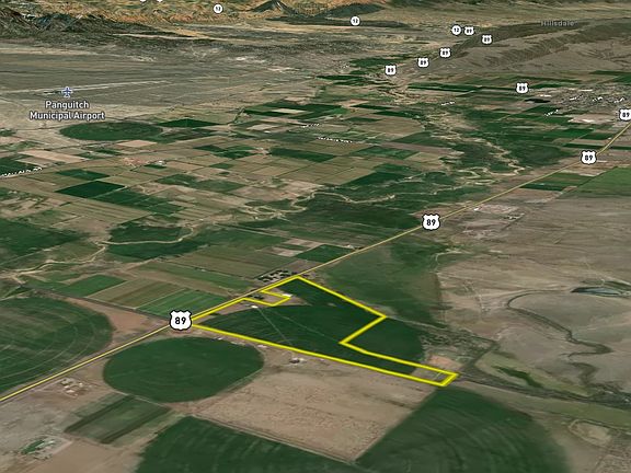 This 50-acre property in Garfield County, Utah, offers a rare combination of accessibility, infrastructure, and development potential. Located just 4 miles from the town of Panguitch, the land features direct Highway 89 frontage, making it suitable for residential, commercial, or agricultural use. The terrain is mostly flat with a gentle slope to the east, providing panoramic mountain views and sightlines toward the river bottom valley. Utilities and water are already in place, lowering the cost and complexity of development. Included with the property are underground water rights (Water Right 61-391) totaling 10.86 acre-feet, or 130 equivalent livestock units, along with shares in the West Panguitch Irrigation and Reservoir Company. A pivot irrigation system waters much of the property, and soils in the region have supported productive crops and hay for many years. On-site improvements include two hay barns totaling 10,000 square feet of covered storage, perimeter fencing, stock corrals near the highway, and agricultural infrastructure already in place. Well depths in the area range from 80 to 150 feet, offering reliable water access. With only 5% of Garfield County privately owned, buildable parcels with utilities and water rights are increasingly scarce. This property's features make it adaptable to a wide variety of uses, from a single-family home site or subdivision to agricultural expansion or a commercial base of operations. The property's location offers quick access to essential services and a range of recreational destinations. Panguitch provides dining, fuel, shopping, and an airport only minutes away. Nearby attractions include Bryce Canyon National Park, Zion National Park, Dixie National Forest, and two ski resorts-Brian Head and Eagle Point-as well as numerous lakes, trails, and public lands