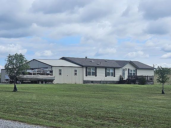 3bed, 2 1/2 bath, 2 living areas and a large kitchen. The master bedroom has a large walk-in closet and a master suite with a large tub and a walk in shower. The other two bedrooms share a bathroom with a tub/shower combo. One living space has a fireplace and a wetbar. The other living area is an open concept with living and dining area as well as a half bath for guest. The garage is a 24x30 with a 30x12 lean-to for storage. The house sits on 9.34 acres. There is a small pond on the property. Located right down the road from Comanche Lake and the golf course.
