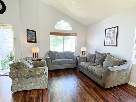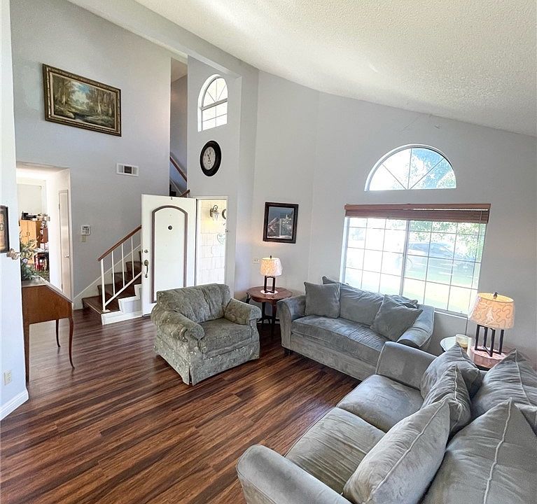 This Single-Family 4-bedroom 3-bath Village Lakes Community Home has all the essentials. The Cathedral Ceilings and vinyl Wood Floors invite you into your living and dining space. Your bright kitchen is central and comes with all appliances. The kitchen sink has a direct backyard view, and the breakfast bar overlooks the cozy Family Room with gas or wood burning Fireplace. Exit to the lush backyard from your new dual-paned glass sliding door to pick your Mandarin, Apple, Lemon, & Avocado Trees. Your Private Backyard retreat is a well-groomed enclosed space. The attached 2-Car Garage allows private and secure entry into your home directly from the car. Upstairs you will find your sleeping quarters with Master suite boasting his and her closets. The roof was replaced just 2 years ago, new dual-paned windows were installed along the backside of the home, and hardwood floor was installed in the living areas, hallways, stairs, & new bedroom carpet. Trash is included with property tax! The Community provides a scenic Greenbelt Walking Trail to the Pool/Spa, and 2 Lakes with Pond & Wildlife like ducks, geese, cranes, and turtles. Guest parking is available. Pride of ownership!