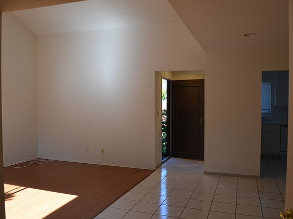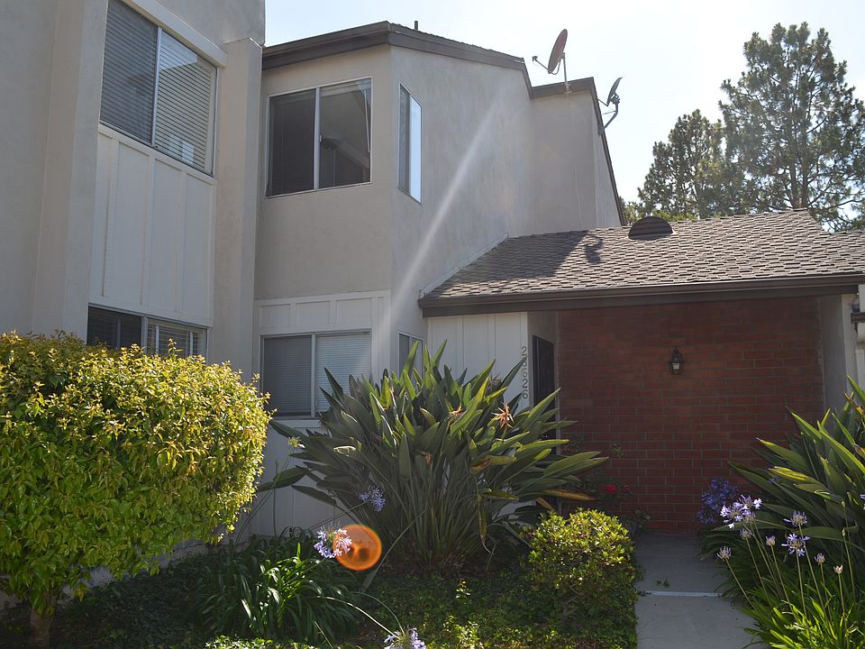 Great location at the back of complex, bright east facing town house with 2 car garage. One bedroom and full bath downstairs.Tile floors in kitchen and dining areas, wood floors living room & bedrooms .very quiet greenbelt at back east of complex. Ample guest parking just across from garage. private patio-yard gives direct access to garage. PV or LA school (optional school zone).close to shopping. The association resurfaced pool and jacuzzi.