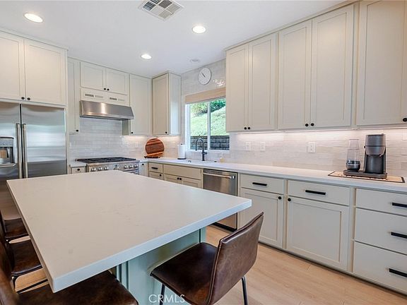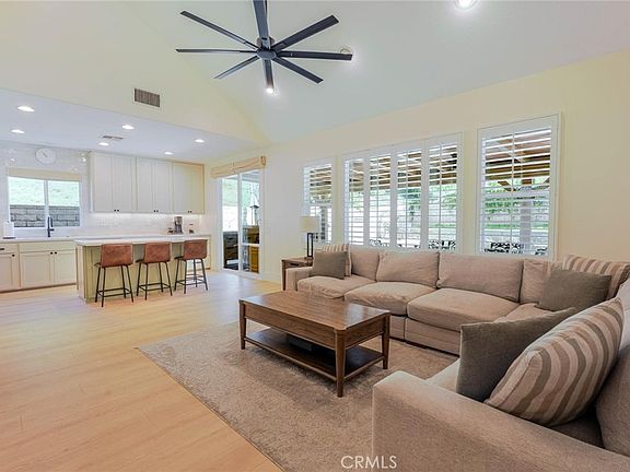 Can’t find a large single story? This popular floorplan has the primary suite PLUS two more bedrooms downstairs! Full bedroom and bathroom upstairs plus a spacious loft. Terric versatility and rarely for sale. This absolutely gorgeous pool home is located at the end of the cul-de-sac. The kitchen is breathtaking. It was remodeled in 2024 with outstanding meticulous finishes. Greige custom cabinetry with 4 ft doors, black hardware, all soft close drawers, island with built-in microwave and pull-out cabinets, quartz countertops, ceramic 3x12 horizontal backsplash and Café appliances. Custom pantry with pull-out drawers. Laminate “white oak” looking floors throughout with 6-inch baseboards. Family room fireplace was redone with new custom doors and tiled fireplace. The primary suite bathroom was also remodeled in 2024 with a custom dual vanity, quartz countertops and a beautiful walk-in shower featuring hexagon white tile flooring and 3x12 tile walls. Primary suite added French doors off the back leading to the covered patio. The other two bedrooms downstairs are also good-sized and share another bathroom which has been remodeled with a custom vanity, mirror and lighting. Linen closet has been added for additional storage right outside the bathroom. Formal living room has a fireplace with custom doors, newer mantel and trendy sconces. Upstairs loft is large and would make a great game room or second family room. Bedroom upstairs is currently set up as an office but has a closet which makes it the 4th bedroom in the house. Entertainers’ backyard! Outdoor island with BBQ, covered patio, pool and spa, and turf! Extra-long and wide driveway with a 3-car garage. No Mello Roos. This home is a 10!!