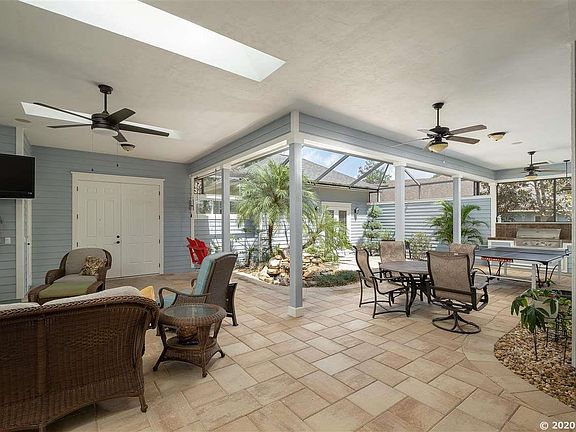 Excellent location for this unique courtyard home in a great neighborhood. A tropical oasis welcomes you in the screened and covered courtyard, featuring waterfall, skylights and outdoor kitchen perfect for casual living and entertaining. From the courtyard, enter into 3384 sf of living space with 5 bedrooms, 4.5 baths and separate guest suite. Beautifully appointed columns, tray ceilings, arches and wood floors on main floor, including primary and guest bedrooms. Outstanding views of waterfall and courtyard can be seen throughout home with several access points. Many upgrades include Executive Kitchen custom cabinetry, built-ins, gas fireplace, over sized garage and closets, central vacuum and energy efficient features. Split floor plan with spacious first-floor primary suite. Guest suite with mini kitchen has its own entrance off courtyard. Grocery, restaurants, healthcare and elementary school just 2 short blocks away. Walking/biking trails, parks, fields, farmers market and regular events add to the community experience. Golf, hard and clay tennis courts, fitness center and pools nearby. Golf cart friendly neighborhood with plenty of room for cart and 2 cars in garage. Virtual tour. Seller is a FL licensed realtor.
