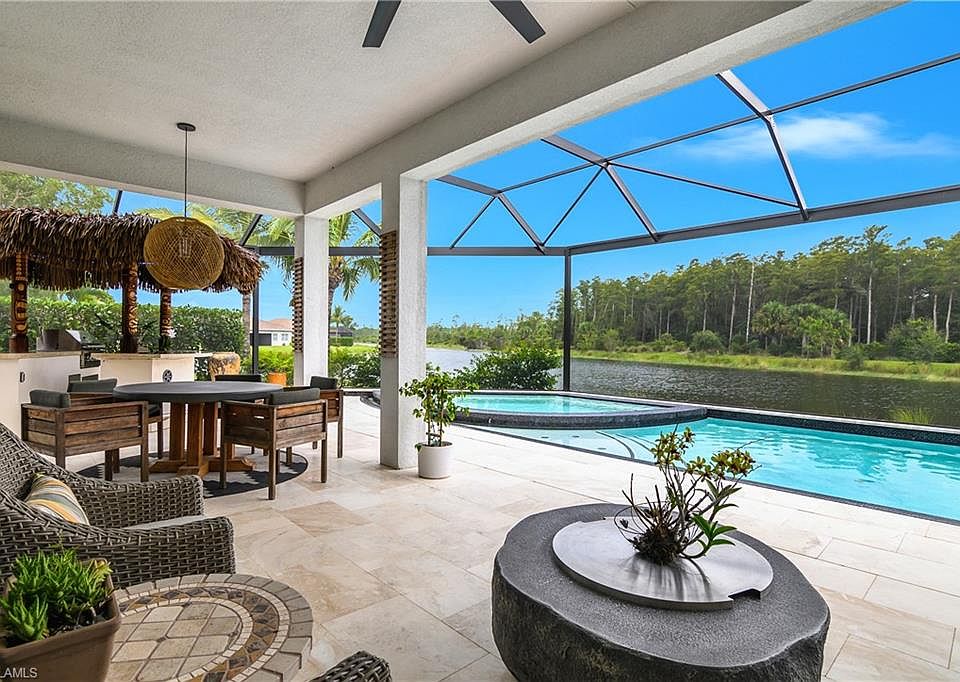Welcome to this stunning Chandon model home in the highly sought-after 55+ community of Valencia Bonita. This beautiful Chandon model has one of if not the BEST WATER AND PRESERVE VIEWS on a perfectly, extremely private pie shaped lot. This home has been significantly upgraded which features upgraded porcelain tile throughout (no carpet), gorgeous custom barn doors to den, a gourmet kitchen with 6 burner professional grade gas stove, beautiful granite, stone farmhouse sink, counter depth refrigerator, open lighted shelves and lighted cabinets going to ceiling, along with a custom glass back splash and a double dishwasher. The living room features a stone accent wall with custom built in cabinets, open lighted shelves, electric fireplace, and recessed TV. The hurricane sliding doors collapse on both sides to allow for true open indoor/outdoor living. The outdoor space includes gas plumped to the fire pit and outdoor tiki Hut. The tiki hut has 2 under counter refrigerators, a tv, and large grill with logs of counter space to entertain. The hot tub seats 12+ people! The pool is long enough to do laps and afterwards you can rinse off with your outdoor shower which has both hot and cold water. Valencia Bonita offers a premier active adult lifestyle, with full-time sports and social directors, eight pickleball courts, eight tennis courts, state-of-the-art fitness facilities, art and activity studios, and a full calendar of entertainment and social clubs. As a newer community, it is easy to connect with neighbors and build lasting friendships. This home is attractively priced for a quick sale and is available for closing as soon as 30 days. For more information or to schedule a private showing, please contact the homeowner, Nancy Wilson, at 704-651-5181.