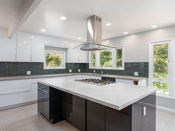 Oversized islandIsland exhaust fanGlass enclosureRenovated kitchenBuilt in buffet cabinetsRecessed led lightsLots of storage