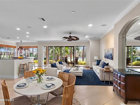 Welcome to the Altessa community within Vasari Golf and Country Club! This home comes complete with a golf membership, allowing you to fully embrace the vibrant golfing community and enjoy all the amenities. The property features a desirable first-floor location with 2 bedrooms, 2 baths, and a den for versatile living. The well-thought-out design includes split bedrooms, ensuring guest privacy and creating a welcoming atmosphere. Inside, the home boasts modern upgrades, such as a recently installed air conditioning system, new refrigerator, and dishwasher. Embrace the convenience of electronic enhancements like a WiFi thermostat, WiFi garage door entry, and electronic retractable storm shutters. Entertainment is taken to the next level with a surround sound system, providing an immersive experience in your living space. Enjoy breathtaking views of the golf course from the comfort of your home, and the proximity to the community pool adds to the convenience of your lifestyle. Park your vehicles with ease in the attached 2-car garage. Enjoy all that amenity rich Vasari has to offer with 18 championship holes of golf, lighted tennis courts, bocce, pro shop, putting green, aqua range, community pool, you will love the resort style living with poolside bar/grill and a finer fare offered in the lovely clubhouse restaurant. Centrally located to sandy gulf beaches, downtown Naples and RSW airport, lots of shopping, dining options, arts and so much more to enjoy here in SW Florida!