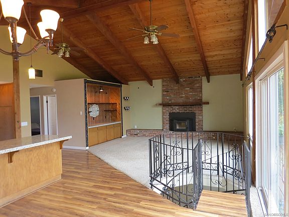 Unique split level family home with breath taking views, and newly upgraded living space. Open floor plan with vaulted open beam ceilings, entertainers kitchen, built in bar area, laminate flooring, granite counters, three wood fireplaces, and private master on-suite spa retreat. Finished basement area could be used as additional bedroom or game room. Huge wrap around decks with gorgeous views of Valley Center. Two acres with winding paths, lush landscape, and your own replica western mine. Outbuilding could be used as workshop, artist's studio, or workout room. Three car garage with built in storage cabinets and work benches. Complete Solar power system only $303 per month lease powers it all year-round. No HOA. Room for horses, dogs, or livestock. Country Living with all the modern amenities!