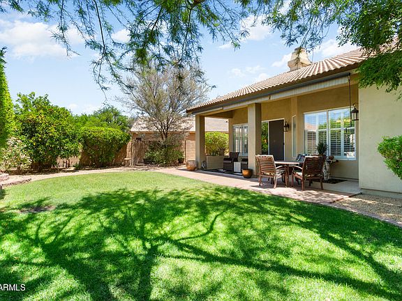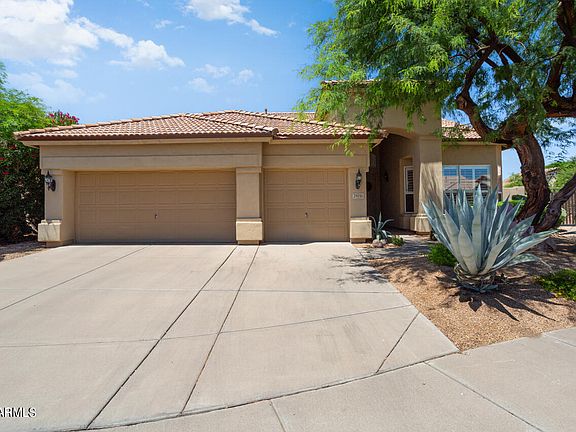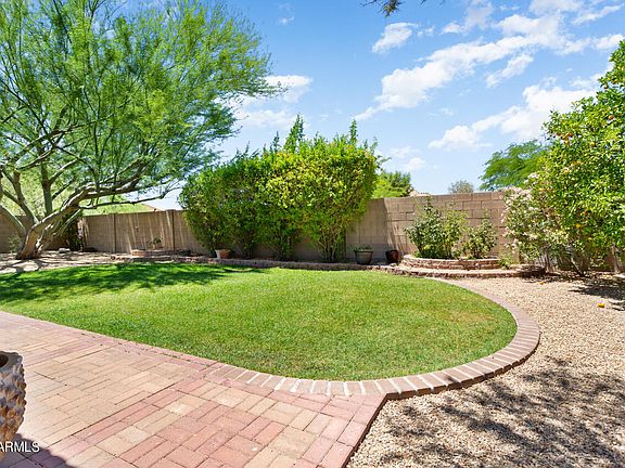 he replaced all the roof underlayment in June of 2021. Soaring ceilings & plantation shutters in every room, granite counter tops throughout, stainless steel appliances, Gas stove, Large eat in kitchen. BONUS - The refrigerator, washer, and dryer convey stay with the home.Big family room with gas fireplace. 20'' Tile floor entire house, Spacious walk in closet, Double sinks in both bathrooms, Raised master vanity with a separate tub and shower. Nicely landscaped yard with an extended patio. Three car garage with storage cabinets, Walking distance to Dynamite Park. Close to Desert Ridge Shopping