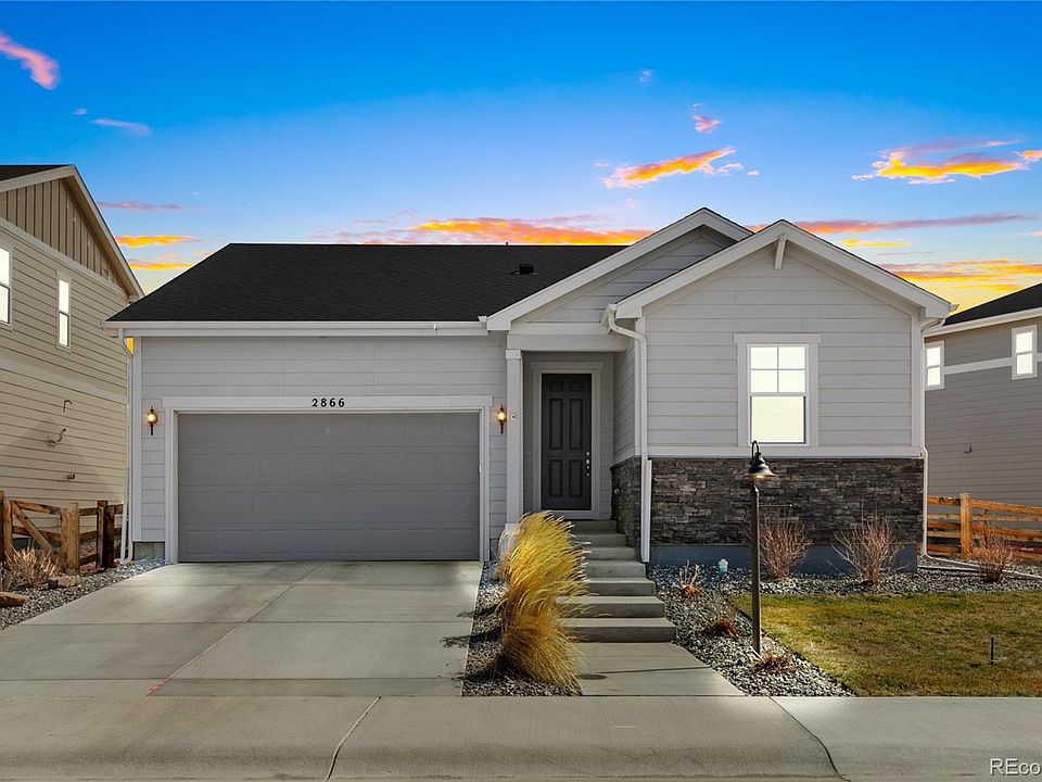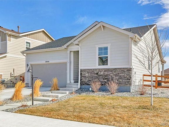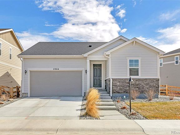 Welcome home to this pristine ranch home located in the desirable Lakes at Centerra. Enjoy main-level living with two bedrooms, two bathrooms, laundry, kitchen, dining, and living areas, all on one floor. In addition to the main living room, you'll find a large flex room that can be used as an office, second living area, and more! The kitchen is spacious, with a large center island, kitchen pantry, and gas cooking. The living room gas fireplace boasts a tile surround that extends to the ceiling, complimented by a large mantel. Ample storage is offered in the separate laundry room and extra deep garages. Retreat at the end of the day to the primary suite with a walk-in closet, attached private bath with walk-in shower, double sinks, and separate water closet. On one of the larger lots in the neighborhood on .19 acres, you'll find established and manicured landscaping. The front of the home is West-facing, and you are greeted with a covered front porch. Enjoy a large covered back patio in the backyard with a gas stub-out for grilling and ample space, and a sideyard gate for easy access. The Lakes at Centerra is in an ideal location with panoramic views of the Rocky Mountains, easy access to I-25, the Budweiser Events Center, and Northern Colorado Regional Airport, and close proximity to nearby golf courses and shopping centers, and a 15-minute commute to Fort Collins. Residents will appreciate a community center, pool, and two impressive lakes. Neighboring Boyd Lake State Park offers water sports, hiking, picnicking, and camping.