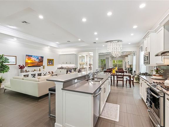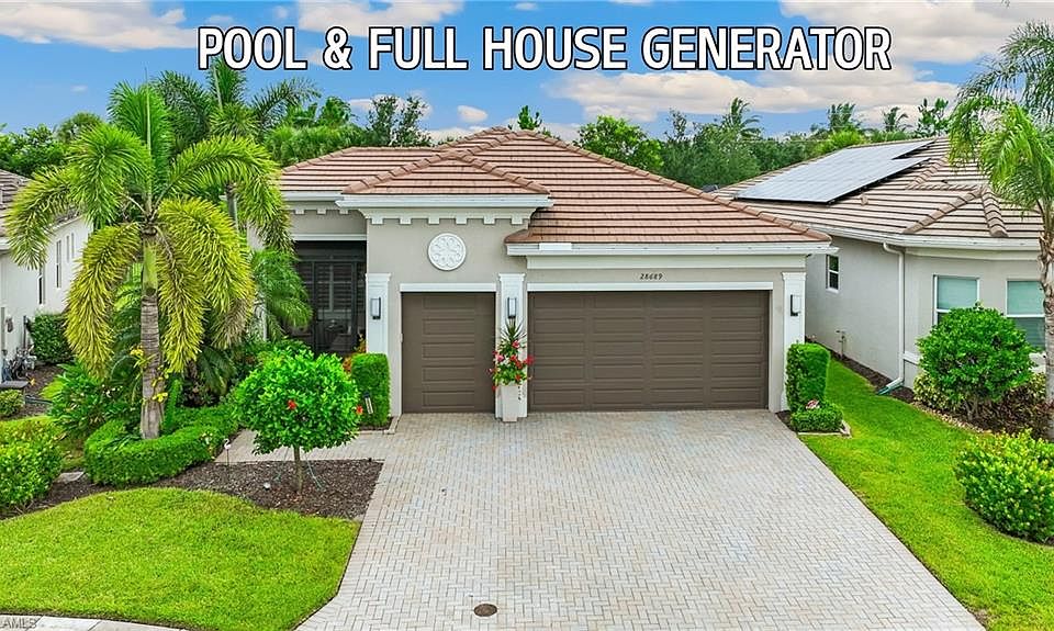 Is the active adult lifestyle calling you? This well-appointed move-in ready “Cabernet” floorplan is positioned on a lushly landscaped PRIVATE lot with no homes behind, and priced to sell. Built with storm protection in mind, the home includes hurricane-impact windows and doors as well as Storm Smart hurricane-rated motorized shades and a WHOLE-HOUSE NATURAL GAS GENERATOR (providing uninterrupted power and peace of mind). Throughout the home you will see embellishments of designer LED lighting, premium fixtures and ceiling fans, crown molding, and custom motorized window treatments, tankless hot water heater, whole-house water treatment system, and landscape lighting. The great room features a custom bar with cabinetry and a wine refrigerator, perfect for hosting guests. Offering nearly 2,200 square feet of refined living space, this residence features gorgeous porcelain tile flooring throughout (no carpet anywhere) creating a sleek, clean, and low-maintenance environment that enhances both style and comfort. The thoughtfully designed layout includes 3 spacious bedrooms, 2 full bathrooms, plus a gourmet kitchen with a breakfast bar and casual dining area, a light-filled great room, formal dining room, a versatile den or office, and a large laundry room. Storage is abundant, with custom closets, an oversized walk-in storage room complete with built-ins, and a 2.5 CAR AIR-CONDITIONED GARAGE to accommodate a golf cart or more storage. Enjoy both front and rear screened lanais for maximum outdoor living space. The kitchen is beautifully appointed with upgraded appliances, soft-close cabinetry, pull-out shelves, quartz countertops, boasting a perfect open layout ideal for entertaining. The expanded rear lanai is a private oasis, complete with panoramic no-see-um screening, travertine pavers, and a heated saltwater pool with spa jets at both ends and dual waterfalls, and pre-plumbed natural gas line for outdoor kitchen. Valencia Bonita’s resort-style amenities are unparalleled, featuring a spectacular 40,000-square-foot Clubhouse and Sports Center. Residents enjoy an indoor-outdoor restaurant and bar, a vibrant social hall for concerts and themed events, a luxurious spa, multiple pools including resort, lap, and resistance pools, private cabanas, a fully equipped and staffed fitness center, billiards lounge, card rooms, pottery and crafts studio, a professional cooking studio, and courts for tennis, pickleball, and bocce. With dog parks, a pro shop, dozens of fitness classes, a full calendar of resident clubs, and a full-time lifestyle director, this community offers a vibrant lifestyle that rivals the finest resorts. Ideally located just minutes from the white-sand beaches of Southwest Florida, RSW International Airport, and the cultural, dining, and shopping destinations of Bonita Springs, Naples, and Fort Myers.