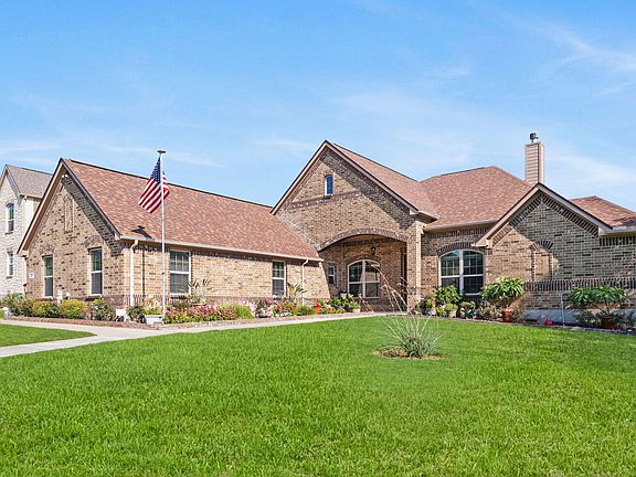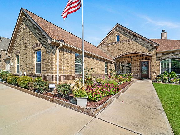 Stunning one-story retreat on one of the largest lots in the neighborhood with no back neighbors thanks to a natural greenbelt buffer. This home features 4 bedrooms, 3.5 bathrooms, and high ceilings throughout. The grand living room showcases a stone-and-brick fireplace, flowing seamlessly to a chef's kitchen with oversized island, upgraded vent hood, granite countertops, stainless steel appliances, walk-in pantry, breakfast nook, and bar area. Entertain with ease in the formal dining room, large front porch, oversized covered patio, and custom pavilion. The primary suite offers a spa-like retreat with double vanities, soaking tub, and separate shower. Secondary bedrooms include one en-suite guest suite and two connected by a Jack-and-Jill bath, each with private vanities. Additional highlights include an office/flex room, movie theater, and 3-car side-entry garage. Mature oaks and persimmons frame the backyard, creating a private and serene outdoor setting perfect for gatherings or relaxation.