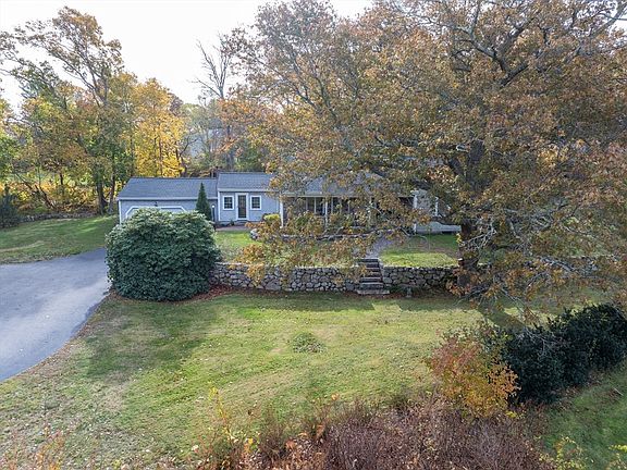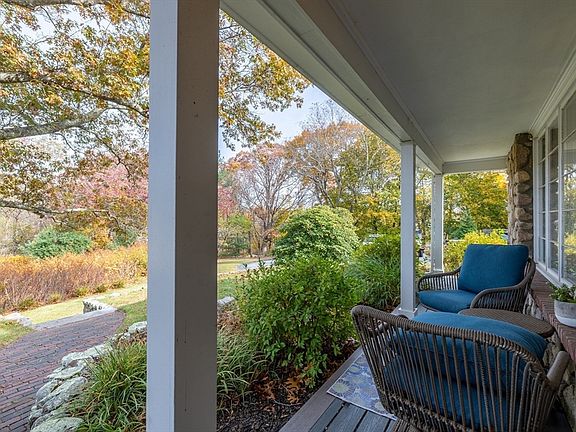 A most enchanting offering, beyond compare at the price point! The owners have created a sublime year round treat for the senses! By elegantly marrying the indoor and myriad outdoor spaces, this already spacious ranch imbues calm and privacy. 2 bedrooms were combined to create a sumptuous primary ensuite sanctuary w/spa-like bathroom and walk-in closet. Direct access from the primary bedroom sits a rejuvenating hot tub anxious to help you decompress. 2nd bedroom also ensuite. The south facing kitchen is naturally bright, offering bucolic views of mature plantings, masterful stone walls and substantial old-school brick fireplace. Sophisticated leathered granite kitchen counters. Finished lower level is a bonus w/family room + 1/2 bath, it can easily double as spare bedroom. Magical grounds including: resplendent mature plantings, 3 patios, stone walls, custom outbuilding and even a chipping green w/ball return! Charming sealed brick floor in sitting room. Oversized 2 car attached garage