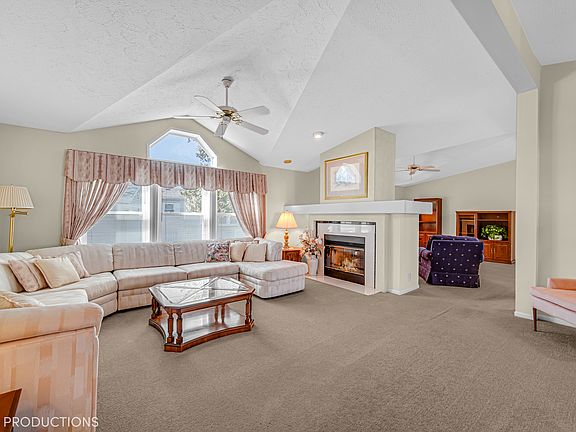 Beautiful Home in a 55+ Community - Bright, Spacious, and Move-In Ready! Mrs. Meticulous lives here! Welcome to this stunning, bright, and airy home designed for comfort and easy living! Offering three bedrooms and two full baths, including a master suite with en suite bath and his-and-hers closets for extra storage. The open-concept layout features vaulted ceilings, creating an expansive feel throughout the living areas. The kitchen is a cook's delight, complete with plenty of cabinetry, an island, and all appliances. Built-in lighted shelving in the dining room adds both style and functionality, while the double-sided fireplace offers cozy ambiance to both the family room and living room. Enjoy the convenience of a separate laundry room with washer and dryer included, and peace of mind with updated windows, a newer roof, and brand-new AC. The oversized two-car garage and large driveway provide ample parking, and the private patio is perfect for relaxing outdoors with no neighbors behind you. This fantastic community offers a clubhouse with activities and a welcoming atmosphere, perfect for an active lifestyle. Don't miss the opportunity to live in a wonderful location with everything you need at your fingertips!
