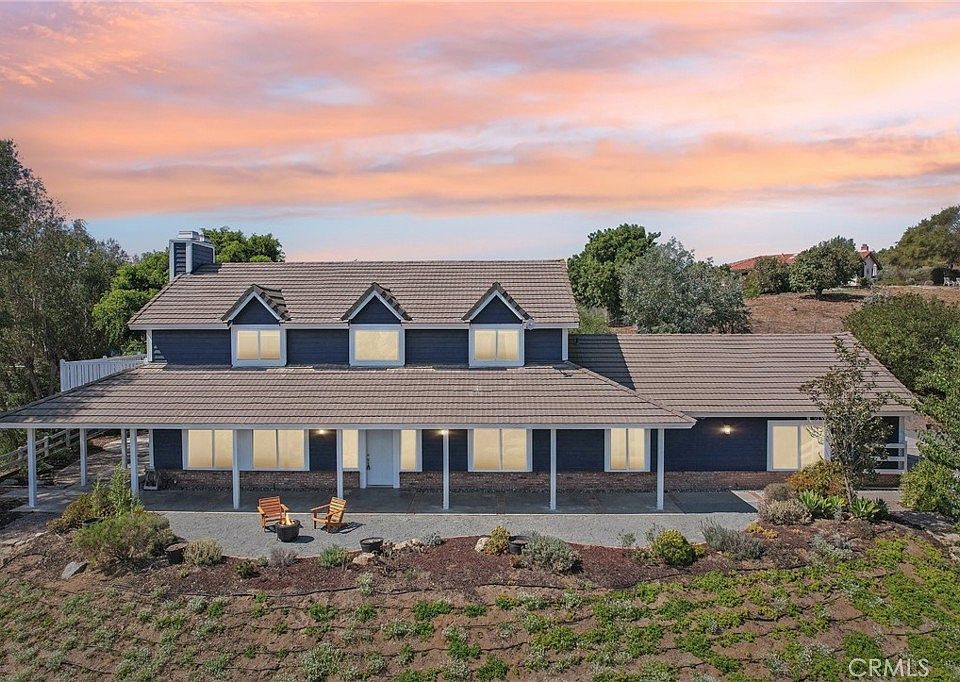 Completely renovated home on acreage with privacy and panoramic mountain views. This beautiful three bedroom with additional office that could be a fourth bedroom and two and a half bath Cape Cod Style home on just under 3 acres is surrounded by beautiful landscape, orchard trees, and breathtaking panoramic views. This home has been completely renovated including bamboo wood flooring throughout, interior/exterior paint, solar system, fully updated kitchen with quartz waterfall countertop, farmhouse sink, stainless appliances with gas stove, large downstairs office/den that could easily be converted to bedroom with sliding barn doors, custom paneled wall, and an abundance of natural light with mountain views out the window, brand new dual pane windows throughout, the primary suite features vaulted ceilings, french doors that open to your own private balcony with a view, large oversized primary bathroom with soaking tub, dual sinks, separate shower stall, and custom walk in built in closet. Almost 3 acres of land for you to... grow grapes, add an ADU, add a pool, raise chickens with the custom built chicken coop, or all of the above. Entertain family, friends, and host many gatherings while enjoying the space and scenery of this beautiful private estate. Property has room for horses and turn out area. Close to many trails, wineries, and historic downtown Fallbrook. You can find yourself exploring on the beautiful trails of De Luz canyon or just relaxing and enjoying the views from your covered porch. Don’t miss this rare opportunity to live in the historic “Avocado Capital of the World”