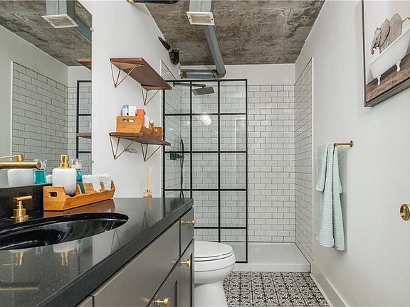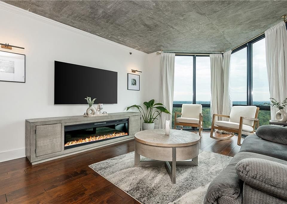 A true standout at The Concorde, this one-of-a-kind one bedroom residence redefines what condo living in Buckhead can be. Thoughtfully redesigned with a modern open concept layout, this home is the only 1-BR unit in the building to feature a full kitchen island, creating a seamless flow between cooking, dining, and entertaining. The kitchen itself is a showpiece, with dual tone shaker cabinetry, sleek hardware, open wood shelving, a subway tile backsplash, a built-in wine fridge, and elevated light fixtures that add warmth and sophistication to the space. The exposed concrete ceilings with visible ductwork give the home an industrial edge that feels both modern and authentic, something rarely found in this building. The bright and airy living room is framed by floor to ceiling windows showcasing one of the most desirable views in The Concorde, a sweeping west facing panorama over Buckhead’s lush tree canopy that glows at sunset. The spacious bedroom enjoys the same natural light and skyline views, complemented by a large walk-in closet and beautiful hardwood floors that run throughout the home. The renovated bathroom features a walk-in subway tile shower, designer floor tile, and striking gold hardware that ties the space together with timeless style. Additional highlights include in-unit laundry with a washer and dryer, elevated lighting throughout, and thoughtfully designed storage solutions. Residents of The Concorde enjoy 24 hour concierge service, a resort style pool, tennis courts, a state of the art fitness center, a private dog park, and secure gated parking, all in one of Buckhead’s most convenient and walkable locations just moments from the Shops of Buckhead, Whole Foods, and some of Atlanta’s best dining and nightlife. With its distinctive layout, designer finishes, and incredible west facing views, this condo represents a rare opportunity to own a truly unique home in one of Buckhead’s most established high rises.