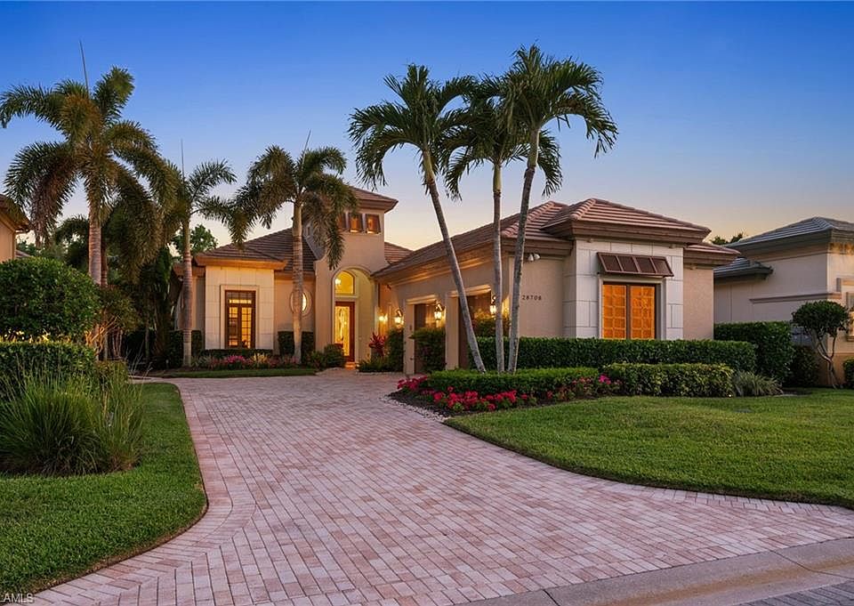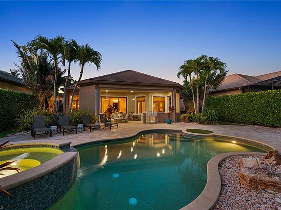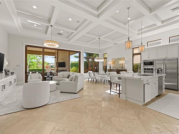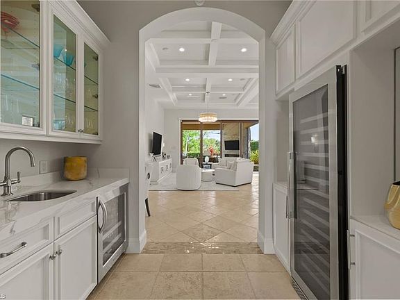 Step into this beautifully updated residence where classic architecture meets modern sophistication. Thoughtfully redesigned by Clive Daniels, this home blends Florida charm with contemporary flair. The open floor plan lends itself to entertaining with a bright and airy great room highlighted by a glamorous TV wall and opening to the gourmet kitchen with white cabinetry, stainless-steel appliances and a reverse osmosis system. The adjacent dining area offers spectacular outdoor views and features Clive Daniel custom-designed furniture and new chandelier lighting. As you tour the home, you will find that every detail has been curated with updated, upgraded elements to elevate the SWFL living experience such as spa-inspired bathrooms, room-darkening shades, stylish wallpaper, new window treatments and lighting. The emphasis is on living spaces for entertaining or simply a quiet retreat. Of course, the highlight of every Florida home is the outdoor space, and this home exceeds anyone’s wish list. Completely re-imagined by Clive Daniels is the new outdoor kitchen featuring a porcelain island and feature wall, new gas fireplace, television and outdoor furniture arranged to accommodate both dining and relaxation. New retractable screens and a new putting green add to this fun-filled space where you can drink in the water, golf and perfect southwest sunset views!