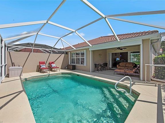 This rarely available Carrington attached villa has that one extra room that everyone wants for a office, or extra bedroom. This home has been well cared for and the owners have invested $33,000 in updates. AC, All Appliances, Hot Water Heater, Pool Equipment, Storm Shutters, Fans, and more all updated. The owner's suite is located at the rear of the home with the guest bedroom and bath at the front for maximum privacy. Frameless shower in the primary bathroom. Good size den with doors and can second as a bedroom with Murphy Bed that is included. The large, screened lanai lets you enjoy the lovely, heated pool and water view. Home has Storm Shutters throughout and has been recently painted. Village Walk is an amenity rich community with 2 pools, hair salon, bagel shop, post office, restaurant & bar, bocce, basketball, play area, resort and lap pools, pickle ball, Har-Tru tennis courts, and a full-time activities director. 22 miles of walkways and venetian bridges over the beautiful lakes. Convenient to Coconut Point Mall, Naples, airport, and the beaches. Its located in the community just a short stroll to the beloved Butterfly Gardens.