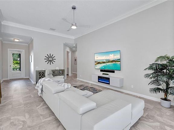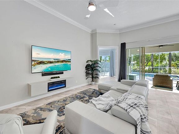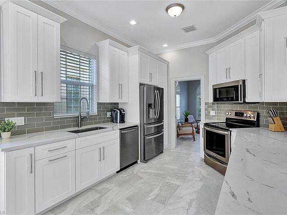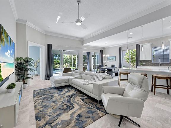 Experience carefree living in this stunning, fully upgraded TURNKEY home in Village Walk of Bonita Springs. With a brand-new roof (2024) and all-new mechanicals, this property is designed for a low-maintenance lifestyle. The interior boasts new custom matte tile flooring, fresh paint, modern lighting, and ceiling fans, along with custom millwork on all trims. The exceptional kitchen features an open layout with custom handmade cabinetry, 48-inch upper cabinets, Calcutta quartz countertops, and new stainless appliances, seamlessly connecting to the family room for easy entertaining. A stylish dry bar with a quartz counter and bar refrigerator enhances the space for hosting gatherings. The owner’s suite bath is a luxurious retreat, showcasing new quartz countertops, a custom shower, and updated sinks and faucets. The upgraded pool deck features Florida Shellstone, new waterline tile, IntelliConnect technology, IntelliBrite lighting, and new screening, creating an inviting outdoor oasis. The exterior has been meticulously updated with new gutters, downspouts, lighting, and landscaping. Located in a vibrant, gated community, you’ll enjoy the convenience of nearby beaches, the airport, shopping, and dining, along with access to 22 miles of scenic walkways, tennis, pickleball, bocce, resort and lap pools, and a full-time activities director. With all kitchen appliances, washer, dryer, pool heater, pump, and filter being less than two years old, this home requires nothing but your personal touch. Move in and enjoy a worry-free lifestyle in this beautifully maintained property!