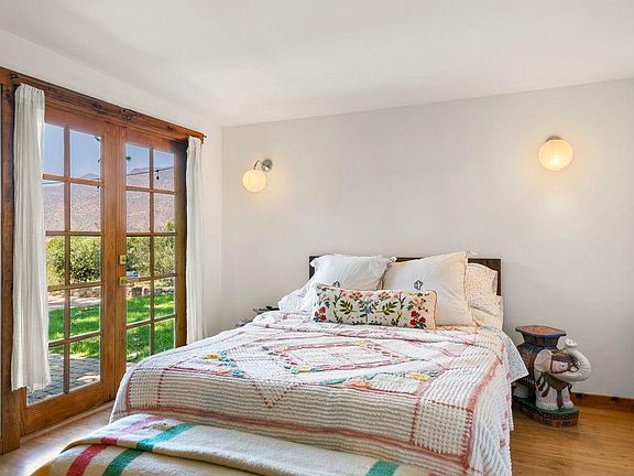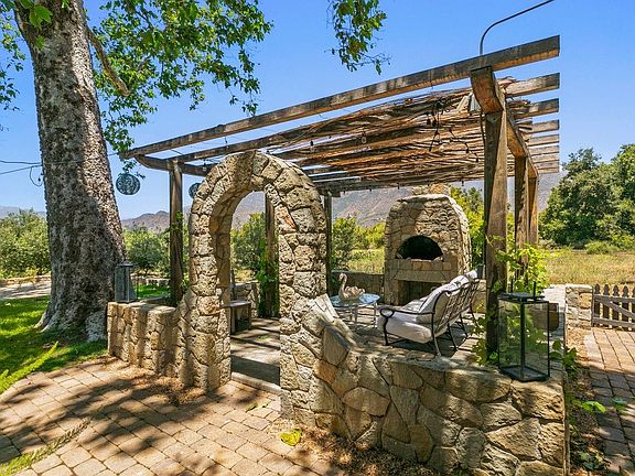 Introducing an exquisite Farmhouse located in the prestigious East End of Ojai, this exceptional property showcases breathtaking mountain views over nearly two acres of pristine land. The residence features meticulously crafted stone walls and manicured gardens, evoking an atmosphere of refined elegance. Enveloped by thriving Olive trees and abundant Orange orchards, this home offers a tranquil and picturesque setting. The expansive outdoor entertaining area, complete with a charming stone fireplace, provides a generous and inviting space for hosting guests, while taking in the awe-inspiring vistas of the majestic Topa Topa mountains, Pink Moment. Enhancing the appeal of this estate is a detached 2-car garage, possibly converted a future ADU. There is a second driveway entrance ensuring ample parking and entertainment space, creating a hobby farm or accommodating horses. Benefitting from its secluded location, without immediate neighbors, and its proximity to the Ojai village, this property serves as an exceptional retreat, offering a harmonious blend of privacy and convenience.