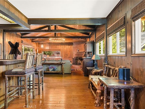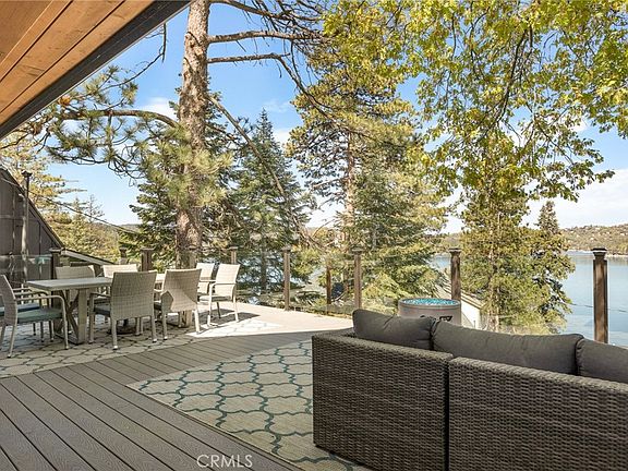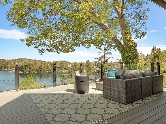 Located in one of Lake Arrowhead's most sought after enclaves, The Palisades, this 1st tier home with expansive lake views is truly a home for all seasons. Built in 1949, this serene getaway has thoughtful updates throughout, yet still retains its charm as a traditional lake home. On the main floor you will find a rustic family room with a large brick fireplace, beamed ceilings, and built-in bar, making it the perfect space for entertaining or enjoying a cozy evening in. The family room opens to the rear patio, with plenty of usable outdoor space. The kitchen is fully equipped and has a beautiful lake view that can be enjoyed while preparing and sharing meals. Both the kitchen and dining area open to the living space making the floor plan conducive to modern day living. The living area boasts another fireplace and opens to the large entertainer's deck which will become your beloved sanctuary for taking in the sunrises and sunsets. The sweeping panoramic lake views have only been enhanced by the window glass rails allowing one to take full advantage of the scenery. There is also a main floor bedroom with an en suite bath. As you enter the second floor, there is an adorable bunk landing, which is reminiscent of vintage lake homes. There is another bedroom upstairs with knotty pine details, built ins, a lake view, and an en suite bath. An additional bedroom and bathroom complete the upper level. Downstairs you will find two spacious and private bedrooms with their own bathrooms, making each a quiet retreat for your guests. Upon entering the property there is a separate living space, with a picturesque lake view, and bathroom located above the one car garage and carport, allowing for coverage and convenience on those snowy winter days. A short walk takes you down the lake path that leads you to your own 1/2 double dock with hoist, canopy, and shared dock house/storage just in time to bask in the summer sun. Sold furnished with the dock included, this is a wonderful opportunity to experience the essence of Lake Arrowhead living.