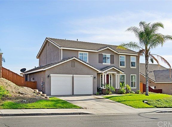 Beautiful and spacious Menifee home with amazing backyard and leased solar. No HOA. This home features a great layout with open floor plan. The kitchen opens to family room with fireplace and spacious living and formal dining rooms with guest bath. Three roomy bedrooms with a spacious loft available for second family room, home office or play area for kids. The master suite includes a walk-in closet, dual vanity & sinks, separate shower, and tub. Two remaining roomy bedrooms share jack and jill full bathroom. Truly entertainers back yard offers the resort style saltwater pool with grotto and waterfall! Fully landscaped backyard with custom concrete work, lush palm trees, producing grape vines, a solid patio cover, built-in BBQ, built in bar counter and plenty of patio space to lounge around outdoors, perfect for entertaining family & friends. Located off the I-215. Minutes to shops, restaurants, hospital & Temecula Wine Country. Must see!