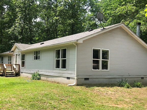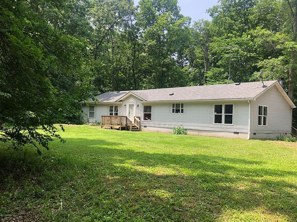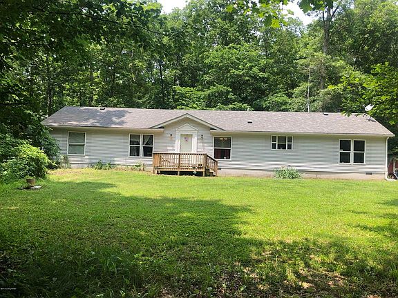 This spacious 3 BR, 2 Full Bath Double-Wide Modular Home is nestled within the trees on a beautiful 10-acre property. There is a Covered Deck facing the woods, great for watching the wildlife. Open feel Kitchen w/ newer counter tops. Appliances to remain. Some painting, newer flooring & light fixtures in many rooms. The toilet in the Master Bath has been replaced. The sink in the Full Hall Bath has been replaced. The home also has Double Pane Windows throughout. The Detached Garage is approx 30' X 30' & has a gravel base. There is also a smaller shed to remain as well. **This property is listed in the floodplain; however, Seller states that water has never gotten any closer than 30-40 feet from the back deck area (Home is also built up 4 cinder blocks high to ensure it will stay dry). The Family Room sports a Wood burning Fireplace with a Blower to warm the home in the winter.Go out into the woods and enjoy nature, deer, turkey, and there is a gully area great for target practice.Close proximity to I-65 and Shepherdsville.
