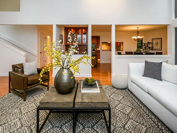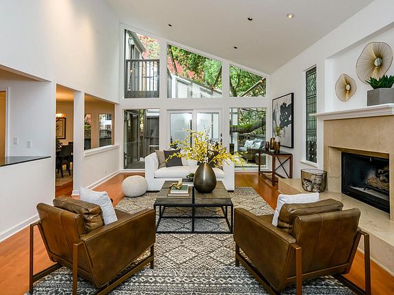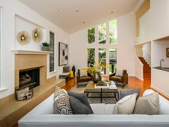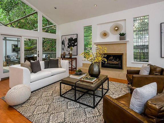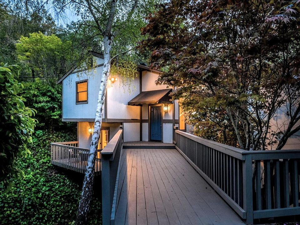 A discreet bridge leads from highly desirable Canyon Road in Burlingame Hills to this three bedroom, two and a half bath home set amid stately trees in a park-like setting. Large windows in every room bring in light & peaceful views of nature & greenery. A spacious living room with vaulted ceiling, fireplace & wet bar is the heart of this home & adjacent to the dining room just off the remodeled kitchen with stainless steal appliances throughout. The dining room, living room and kitchen all share easy access to the rear deck, perfect for indoor-outdoor entertaining & everyday convenience. A home office with private covered deck, main level powder room & laundry complete the main level. An en-suite master & two large bedrooms, both with generous closets, & a full, hallway bath finish the second level. Wrap-around decks, meandering paths through the trees enhance the feeling of living in forest-like serenity yet close to the amenities of Broadway, Burlingame & convenient commuting routes