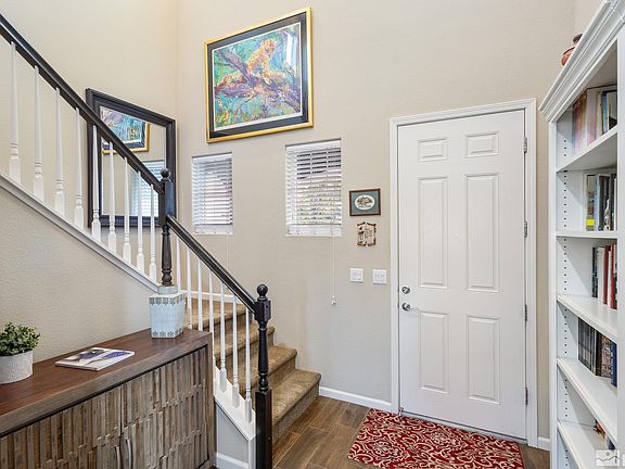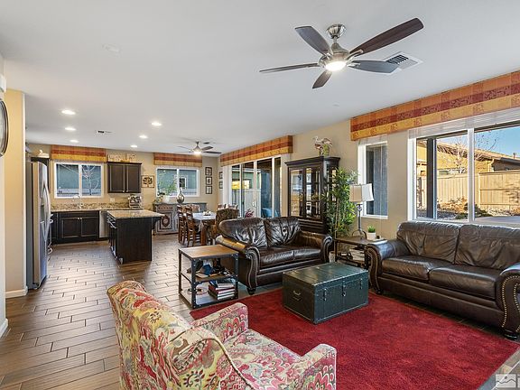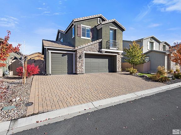 Stunning upgraded home in the highly desirable, gated community of Saddle Ridge in South Reno! Amenities include fitness center, pool, spa, clubhouse, playground and beautiful walking paths. Staffed guard gate. Gorgeous, two-story entry way with grand staircase leads to seamlessly functional dining, living, kitchen and great room areas. The kitchen includes a king-sized, walk-in pantry with tons of storage. The oversized glass sliders offer plenty of natural, light and entry into the spacious, grassy backyard, with intricate pavers and a covered patio, perfect for outdoor entertaining! Large storage shed tucks nicely behind the 3rd car garage. Convenient second-floor laundry room with cabinets and extra hanging space and shelving. Primary bedroom includes a large walk-in closet with extra shelving. Walk-out patio from primary bedroom offers stunning views for your morning coffee! Roomy loft can double as an office space or playroom! Upstairs wet bar offers an additional entertaining area. Surrounding homes are single story, offering unobstructed views of Mt. Rose. Home has extensive builder upgrades including upgraded kitchen cabinets, granite countertops throughout, extra storage cabinets, 8ft doors, extra outlets in the garage, and interior and exterior are pre-wired for surround sound and home alarm system. Automatic sprinklers and full drip system make for easy yard maintenance! Home is zoned for highly desirable schools, and is close to excellent shopping, restaurants, and is a quick drive to the world-class skiing and beaches of Lake Tahoe!