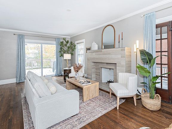 Step inside to find a welcoming living area featuring a luxurious stone fireplace, rich hardwood floors, and abundant natural light. The open floor plan flows seamlessly into the stunning kitchen, highlighted by an exposed brick, granite bar, and custom cabinetry. Enjoy stainless steel appliances, granite countertops, and generous storage space — a perfect setting for both entertaining and everyday living.