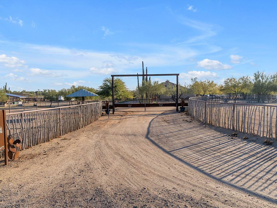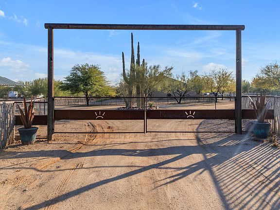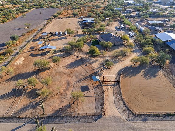 5 acres with complete privacy at the end of a paved, dead end road and only 5 minutes to town. Borders BLM land & Rodeo Grounds and on city water! 125 x 245 roping arena with lights and Priefert chute. Steer pen, catch pen, giant turn outs with shade and covered hay barn. Priefert panel walker w/ crushed rubber footing. Also, additional 100 x 120 arena or could be used as an additional turn out. There are two barns with a total of 8 stalls w/ fans and lights. The 5 box stalls are 14x16 and three oversized stalls with runs. Also a large tack room, 3 additional outbuildings and 3 additional large turnouts with shade in the back. Additionally there are 2 RV plug-ins. This property has 40+ mature trees, 4+ saguaros and has over 3500+ cedar stays tied to the fence. Entire 5 acres is fenced dog tight. This home was custom built in 2005 by previous owner. 2148 sqft with 4 bedroom, 3 full bath plus additional office space. It boasts gorgeous travertine tile throughout, a gas fireplace, and knotty alder cabinets add to the custom feel. This amazing property has a HUGE covered patio, built-in-bbq w/ real stone, granite, pavers & artificial turf and views that will have you catch your breath.