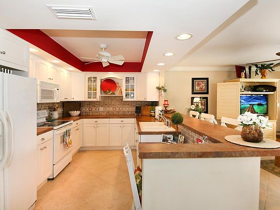 * The open floor plan is professionally decorated with comfortable furnishings, multiple casual seating arrangements where you can see the Gulf of Mexico, rich crown moldings, tiled backsplash in the kitchen with bar-top seating , ceiling fans, and a tiled bar area with fridge.