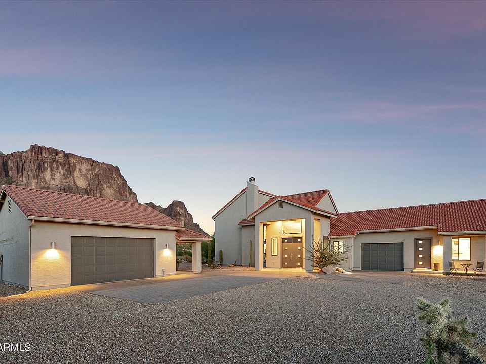 Don't miss out on this incredible value for a stunning home. Price reduced by $20,000!! Discover the epitome of luxury and tranquility at the base of the legendary Superstition Mountains in Apache Junction. This exceptional home seamlessly blends industrial and executive tones with the natural beauty of the surrounding Sonoran Desert, offering a truly unique living experience. Nestled on 2.5 acres of pure privacy, this property offers an awe-inspiring setting where Mule Deer often visit your backyard. The home's impeccable design features a split floor plan with a casita-style fourth bedroom, complete with its own single-car garage. Step into the spacious primary bedroom, boasting a walk in closet and an expansive bathroom. Relax in the massive tub that offers stunning mountain views for the ultimate retreat. The secondary rooms are generously sized, ensuring comfort for all. The incredible entertainer's kitchen is a chef's dream with luxury Stone Creek custom cabinets, premium quartz counter tops, equipped with double ovens, large-capacity refrigerator, a wine fridge, and upgraded features and fixtures throughout. Enjoy the seamless indoor-outdoor flow with a Pella multi-slide patio door, offering sweeping views of city lights and mountain vistas, even while floating in your newer sparkling saltwater pool. For cozy evenings, gather around the charming wood-burning fireplace, adding warmth and ambiance to your living space. Host unforgettable gatherings with the built-in BBQ and custom rebar fence around the pool area. For the hobbyist or car enthusiast, a detached 676 sqft garage, 26 feet deep, provides ample space for your projects, complete with an additional sitting area perfect for observing wildlife. Embrace the tranquility and elegance of this Apache Junction home, where luxury meets the natural beauty of the Sonoran Desert. Your desert oasis awaits!