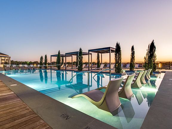 Curved architectureClubhouse dockLuxury apartmentsOpen-concept floor plansSerene painted lakeNature trails