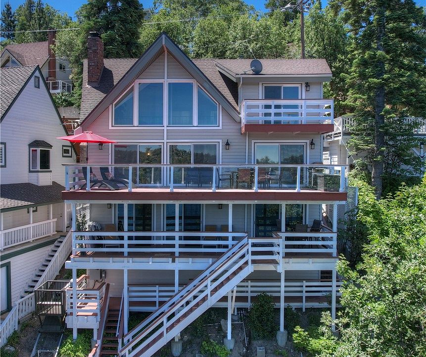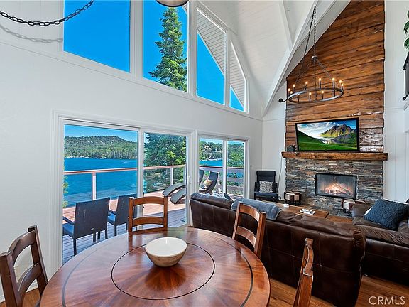 Experience the extraordinary allure of this exceptional Lakefront residence on majestic Lake Arrowhead with breathtaking lake and ridgeline views. Immerse yourself in the luxury of this established vacation rental which includes a private single slip dock and pier directly below. The spacious upper and lower decks offer the epitome of relaxation. This three-story home has undergone meticulous updates, boasting three bedrooms, three bathrooms each on their own level and each with their own bonus room/gathering area providing for ample living space. The open concept of the main level showcases the vaulted living room, gorgeous stone fireplace and a magnificent wall of windows framing the lake’s beauty and panorama. The lake is gracefully visible from every room with the only exception being the bathrooms. This exquisite property comes turn-key and furnished. The Heating and A/C units have also been recently updated. Level parking for 4+ cars. An additional fireplace on the lower level adds to the wonderful mountain ambience. Getting down to the Lake will be a breeze with the newer multi-person Gondola that will transport you and your lake supplies from your back door to your lakefront dock and the lake trail in just minutes!